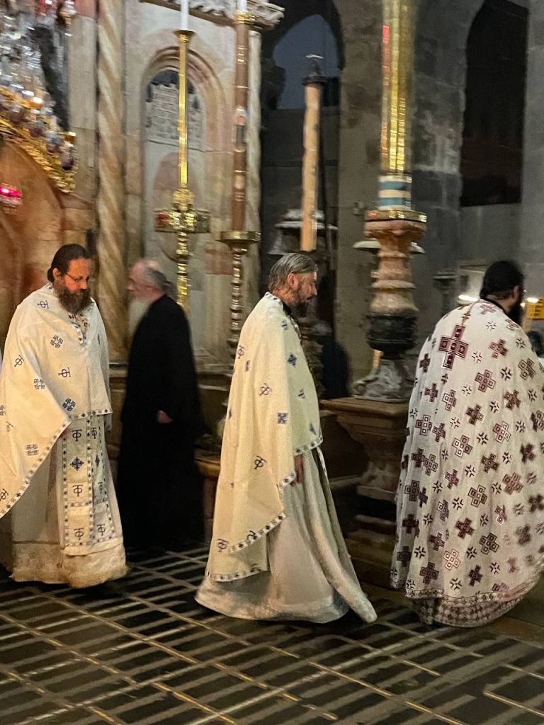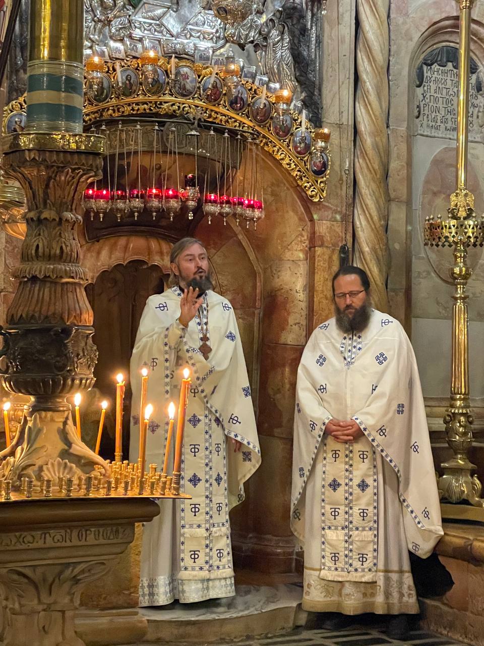 Его Высокопреосвященству сослужили: клирики Святогробского братства, насельник Миссии иеромонах Филофей (Артюшин) и паломники в священном сане из Румынии.